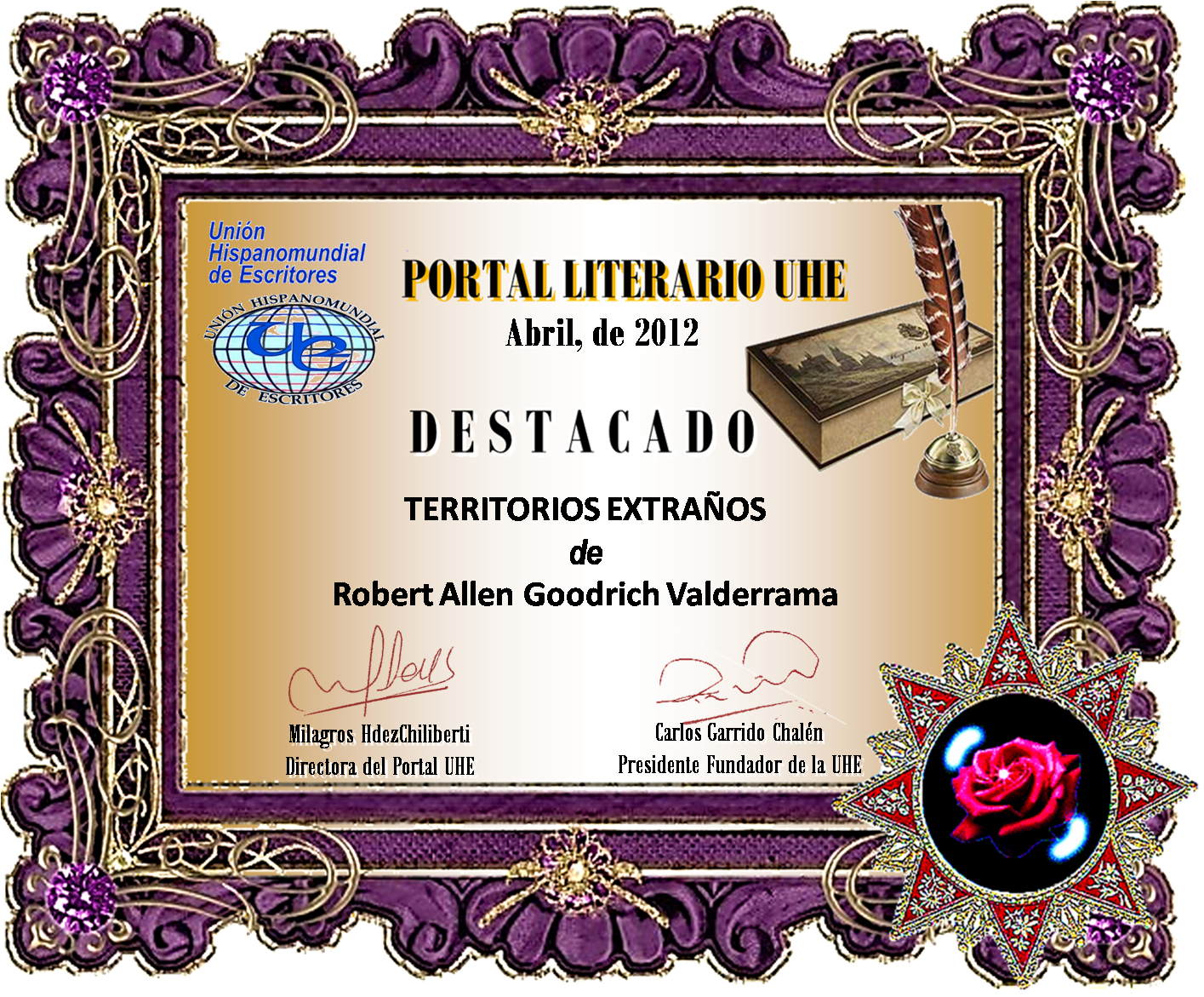Mi agradecimiento a Milagros Hernández Chiliberti, al Dr. Carlos Garrido Chalén y a La Administración y Comite Evaluador por Destacar mi poema: "Territorios Extraños" en el Mes de Abril del 2012 mes en que fue publicado.